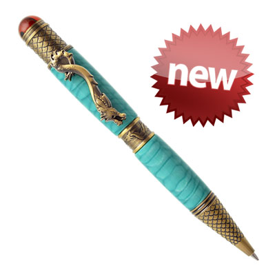 Introducing the Mystic Dragon Pen Kit. Shown here in Antique Brass. This epic pen details a coiling mythical dragon clip, a powerful dragon circling the center band like a fierce protector, and armored scales for just the right grip on the nib. The top cap features a captivating cabochon that is eye-catching.