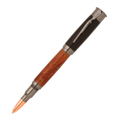 This Over & Under Shotgun Rollerball Pen Kit in gunmetal will make the perfect gift for any hunter, sportsman, trap and skeet shooter or gun enthusiast. Includes a 12ga shotgun shell cap, a .30 caliber bullet style pen body, a shotgun clip, and a premium rollerball refill. Decorate your pen with a dark blank for the cap and wood or camo on the body for an authentic look. Uses 2 tubes, 9/16" and 12.5mm. Features a rose gold nib.