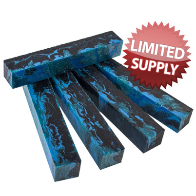 Wipeout is made up of blue, green/blue, and black which blend and swirl together to make a fantastic color! WoodTurningz is proud to manufacture Inlace Acrylester.