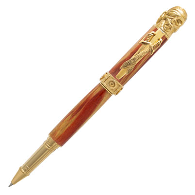 Grab your spyglass and cast your eyes on these beauties! Our exclusive Pirate rollerball in 24kt gold is uniquely designed from top to bottom. The pirate-skull cap posts on the rear of the pen which features wide threads to prevent cross-threading. The pirate theme is completed with a crisscrossed sword pen clip and coin centerband. **Shown on a Flame Boxelder pen blank.