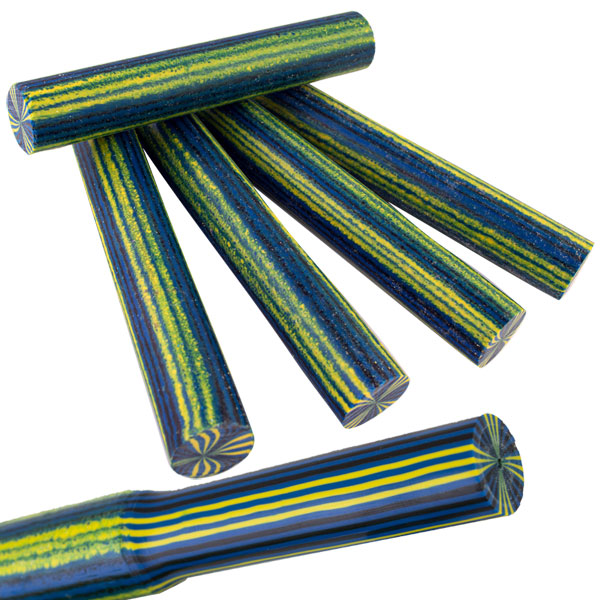 Pinwheel is made up of navy, white and yellow stripes that run lengthwise along the blank. Poly Resin produces exciting color patterns not available in any of our other products! Give this one a try! All blanks are 3/4" round x 5" long.