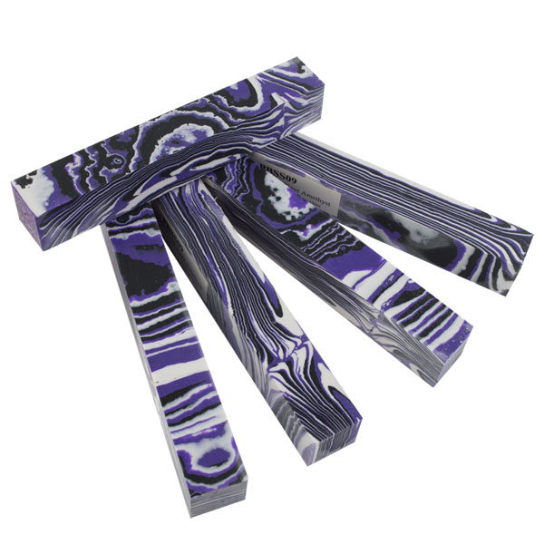 SimStone #09 - Tiger Amethyst blanks are a reconstituted stone but the end product resembles genuine stone. It turns easily and is similar to an acrylic material. Sand and finish your finished project with acrylic finishing products like the #PKFINKIT sanding system and One-Step plastic polish.