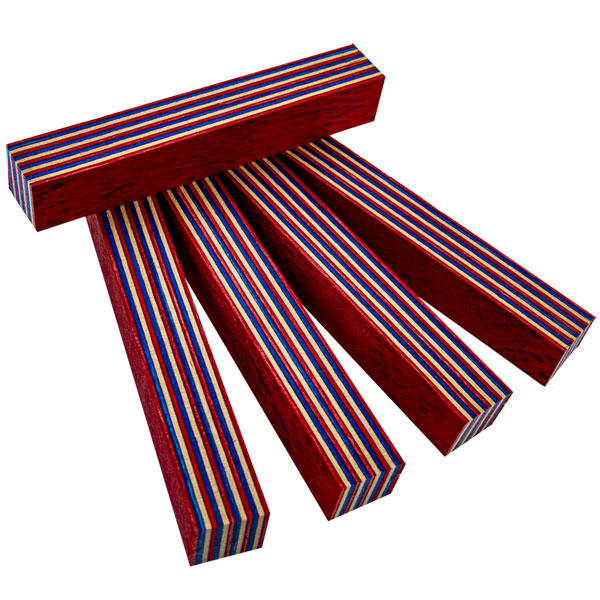 Americana pen blank showcases a captivating array of colors, carefully arranged in alternating layer patterns of natural tone, vibrant red and deep blue dyed woods. The result is an exquisite blend of hues that truly captivate the eye.