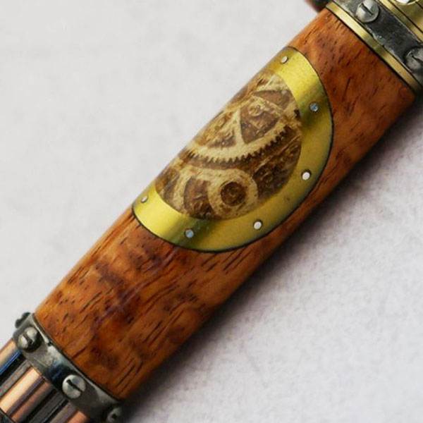 This Steampunk Laser Inlay Kit is designed to specifically for the PSI Steampunk Bolt Action Pen. The main barrel is Afzelia Xylay and the laser engraved sleeve is turned from Maple. Gold metallic acrylic and Sterling Silver wire are also included in the kit. Each kit comes with complete instructions that explains everything in detail so you'll complete this kit easily and successfully. (Does not include the pen kit)