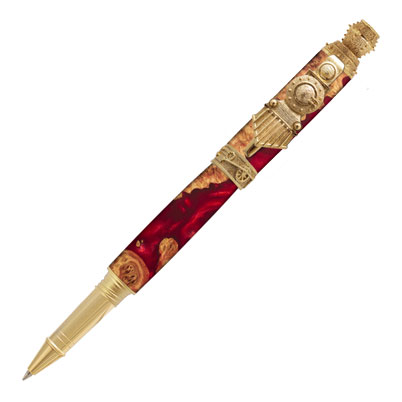 All Aboard! Our exclusive Train rollerball pen in 24 kt gold has been designed to appeal to anyone with an interest in the railroad. The unique clip features the front end of a locomotive complete with a smokestack and wheels that are turning around the centerband. The cap posts on the rear of the pen which features wide threads to prevent cross-threading. Don't miss out on this showstopper! **Shown on Hybridz Burl Mallee in Red.