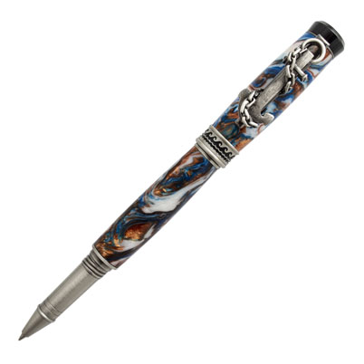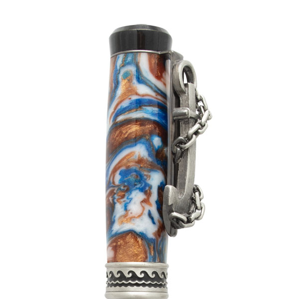 Our Voyager Rollerball in Antique Pewter is a pen kit for nautical lovers and anyone who has a love for sailing, boating, or cruising! The hefty anchor is wrapped in chains on the clip and is truly unique! The center band is encircled with recessed waves, and a ship’s wheel adorns the “aft” end cap of the pen. The cap posts on the rear of the pen and has wide threads to prevent cross threading. This pen is definitely a display piece! (Shown here on a PBIA101 blank - The Abyss).
